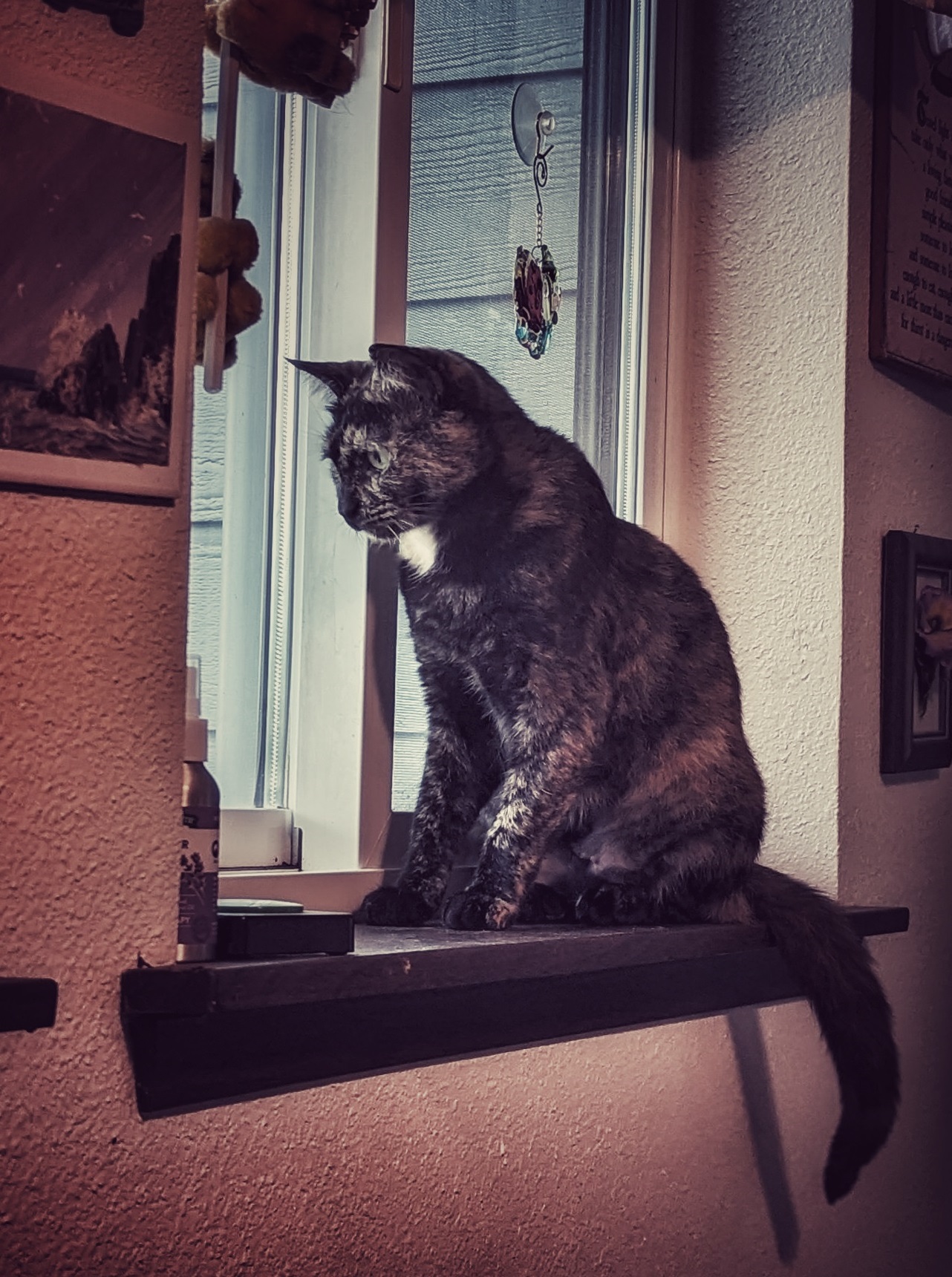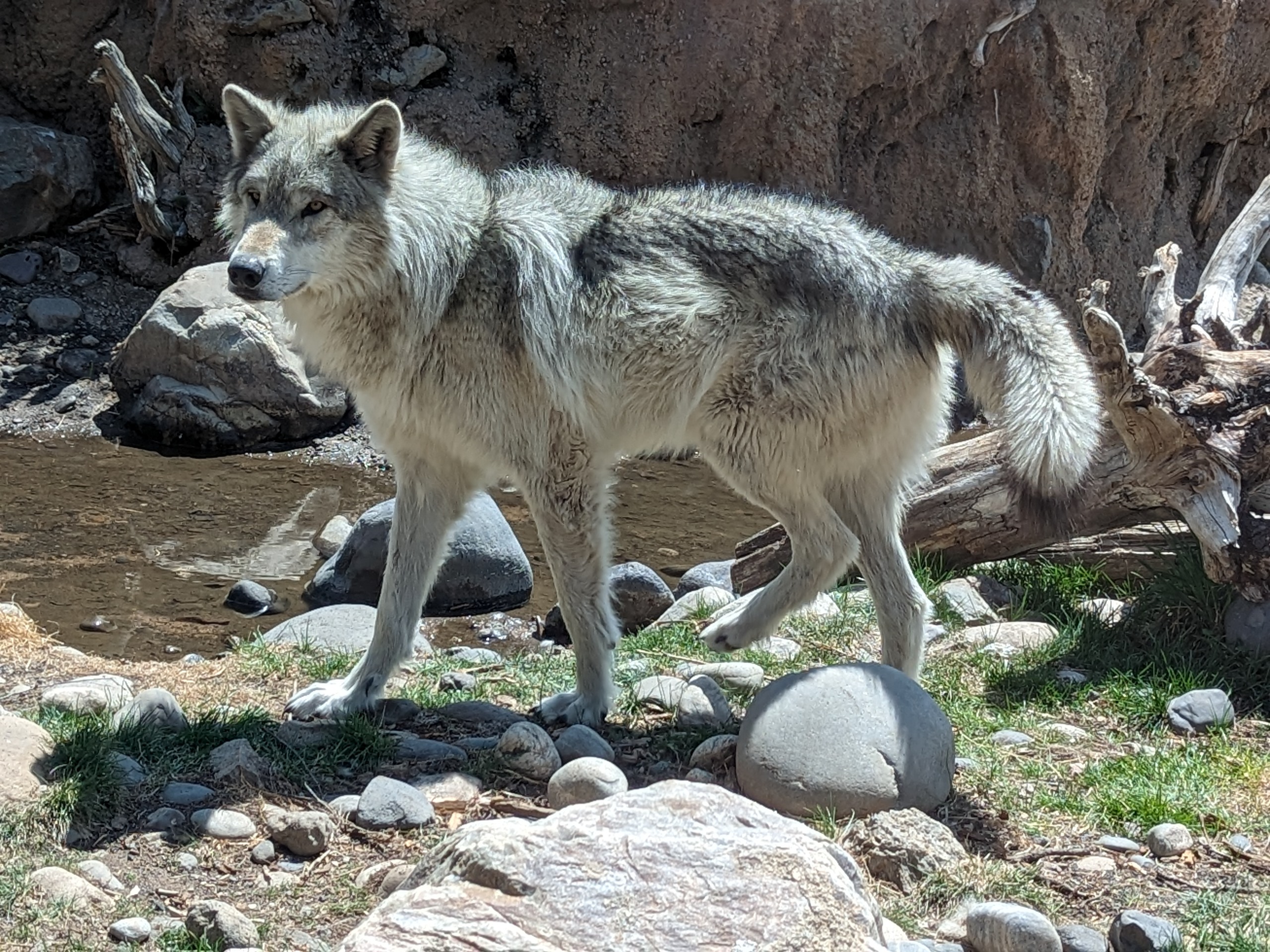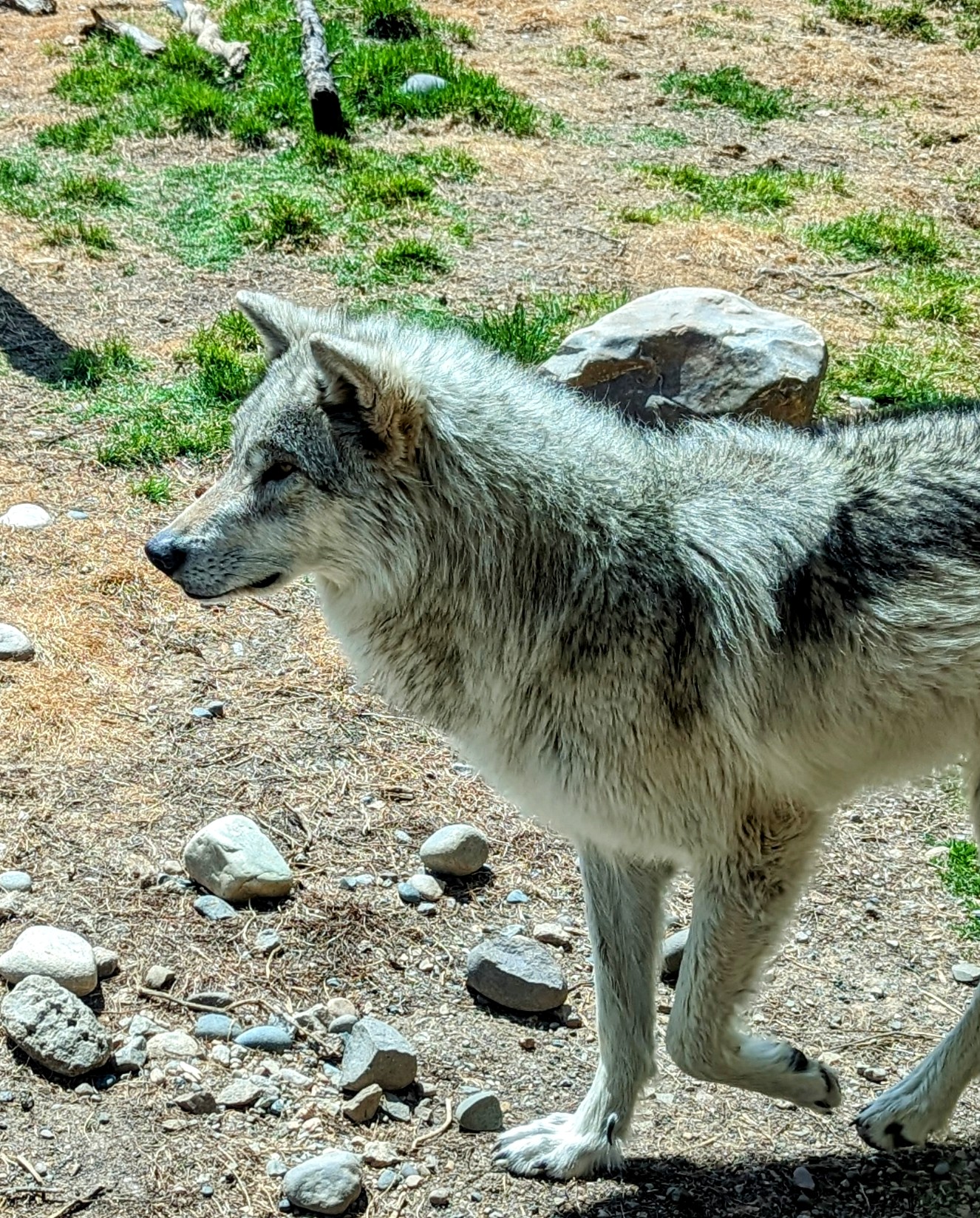 At one of the buildings in the wolf habitat area, there is a statue of a wolf. Several times, I saw a wolf come to the glass enclosure and stare at the statue. I found that fascinating and wondered what he was thinking or sensing. Another enclosure is open with the wolves at more of a distance.